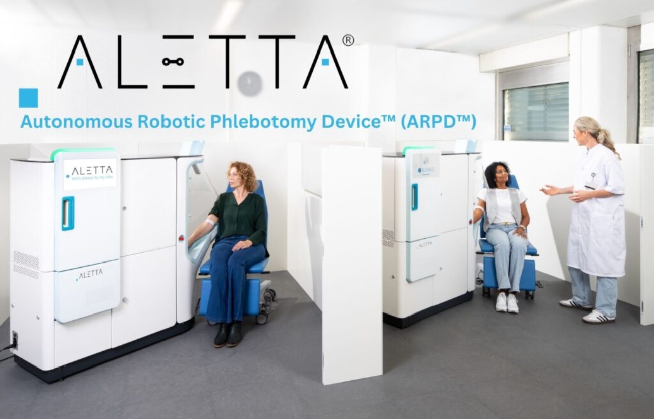 The Aletta platform scans the patient’s arm using near-infrared imaging to detect veins beneath the skin. Ultrasound imaging then assesses the depth and quality of the vessel before a robotic arm performs the puncture. The system monitors the procedure in real time and automatically fills the required sample tubes.